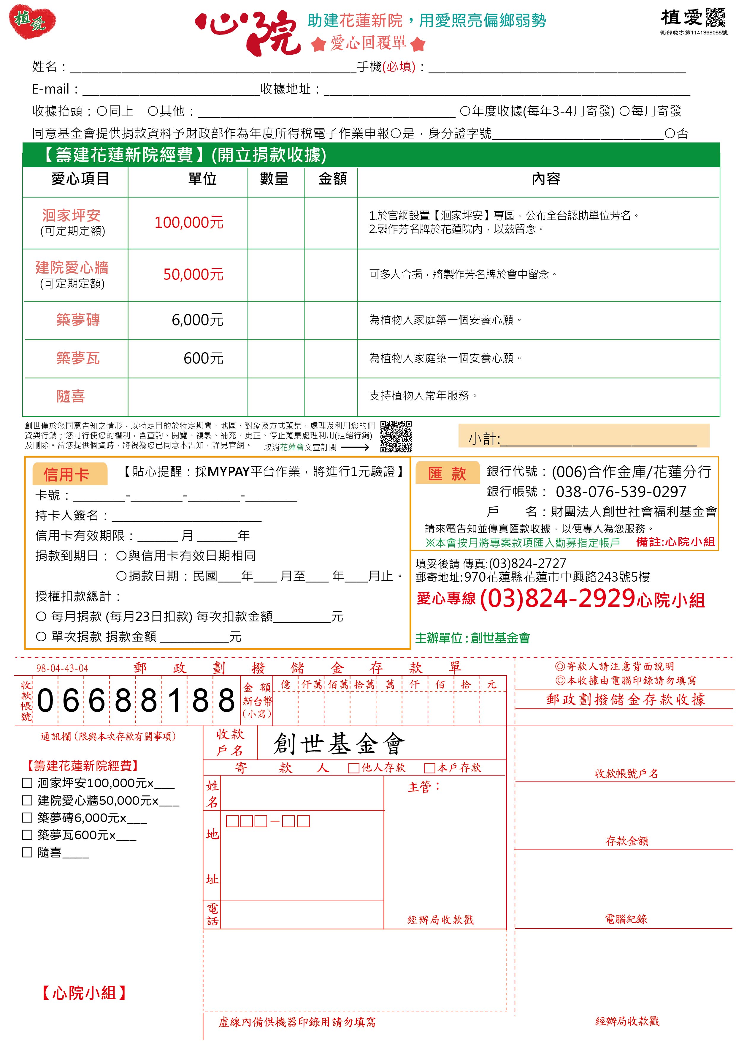 抬頭請開『財團法人創世社會福利基金會』,連同愛心回覆單掛號寄回【心院小組】收。
