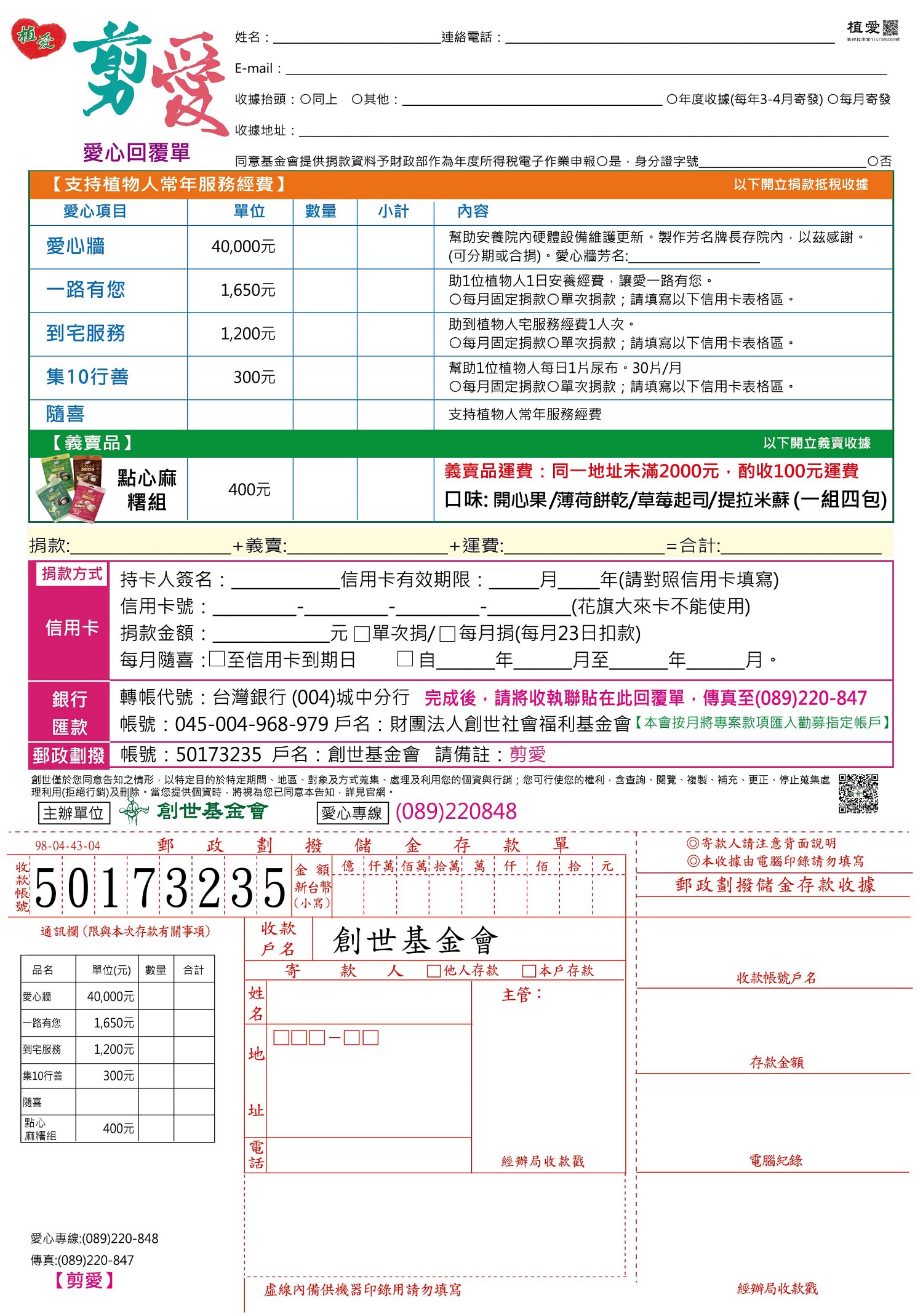 帳號:50173235 戶名:創世基金會,請於備註欄註明「剪愛」。
