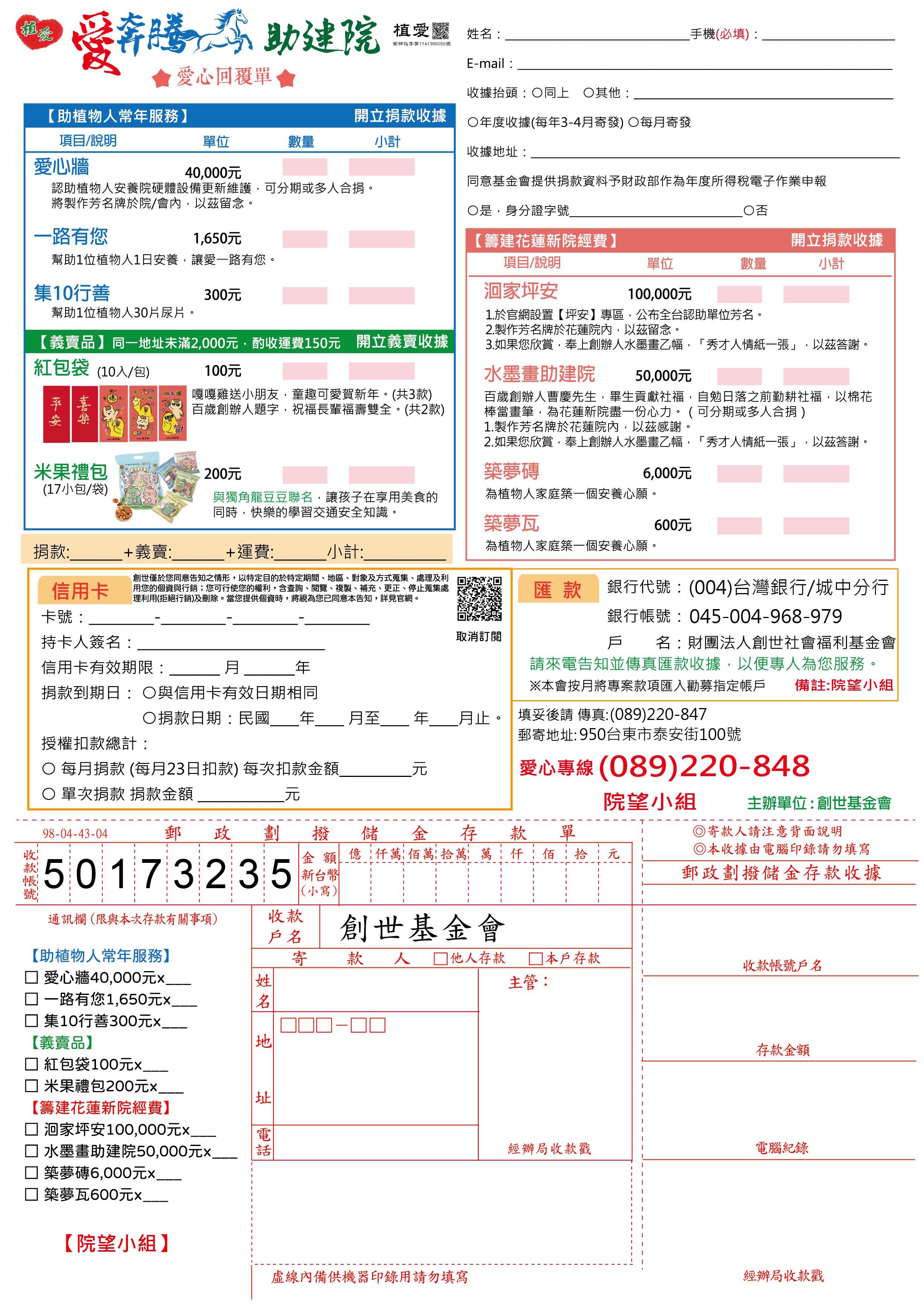 抬頭請開『財團法人創世社會福利基金會』,連同愛心回覆單掛號寄回【院望小組】收。
