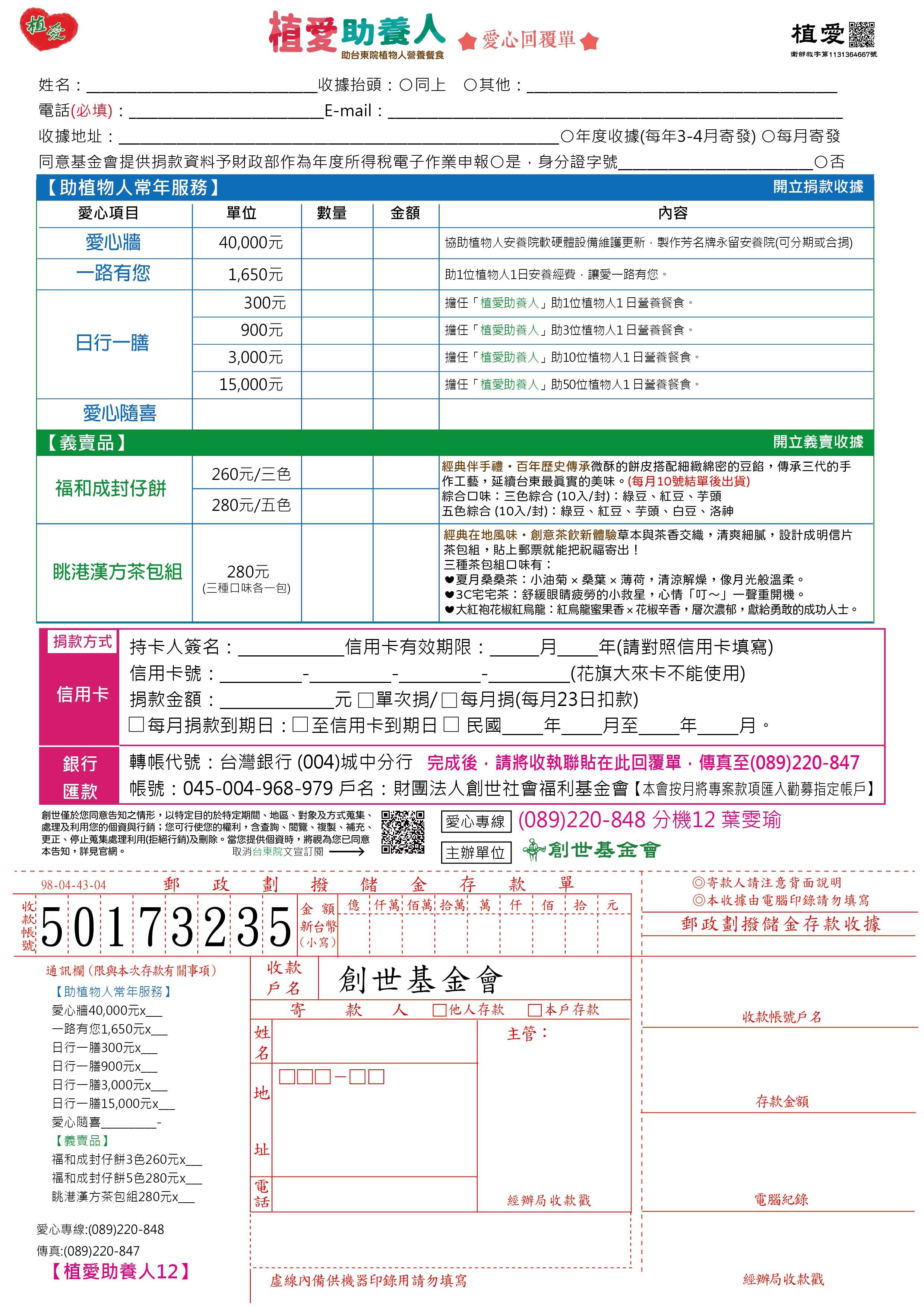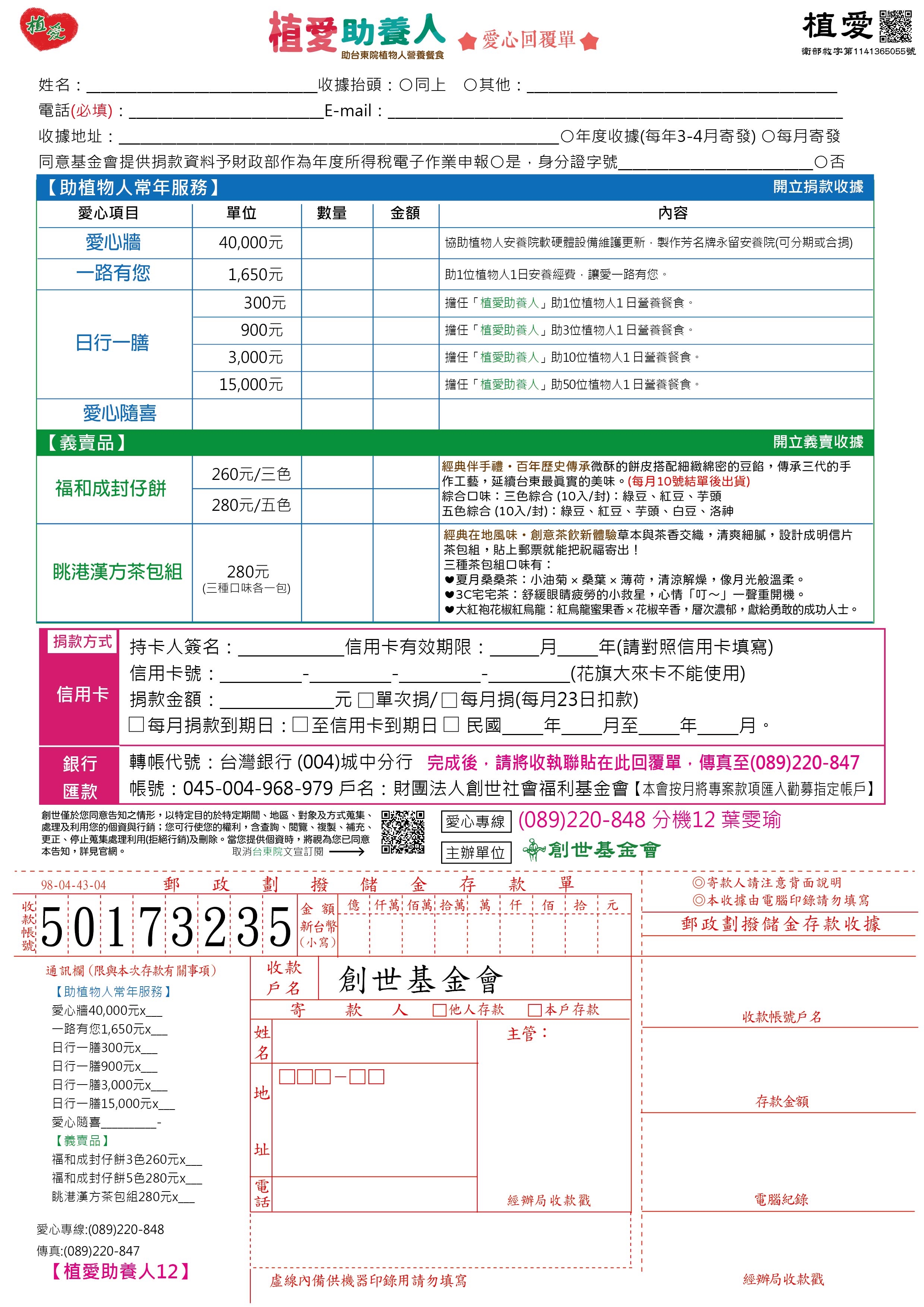 帳號:50173235 戶名:創世基金會 通訊欄註明:【植愛助養人】