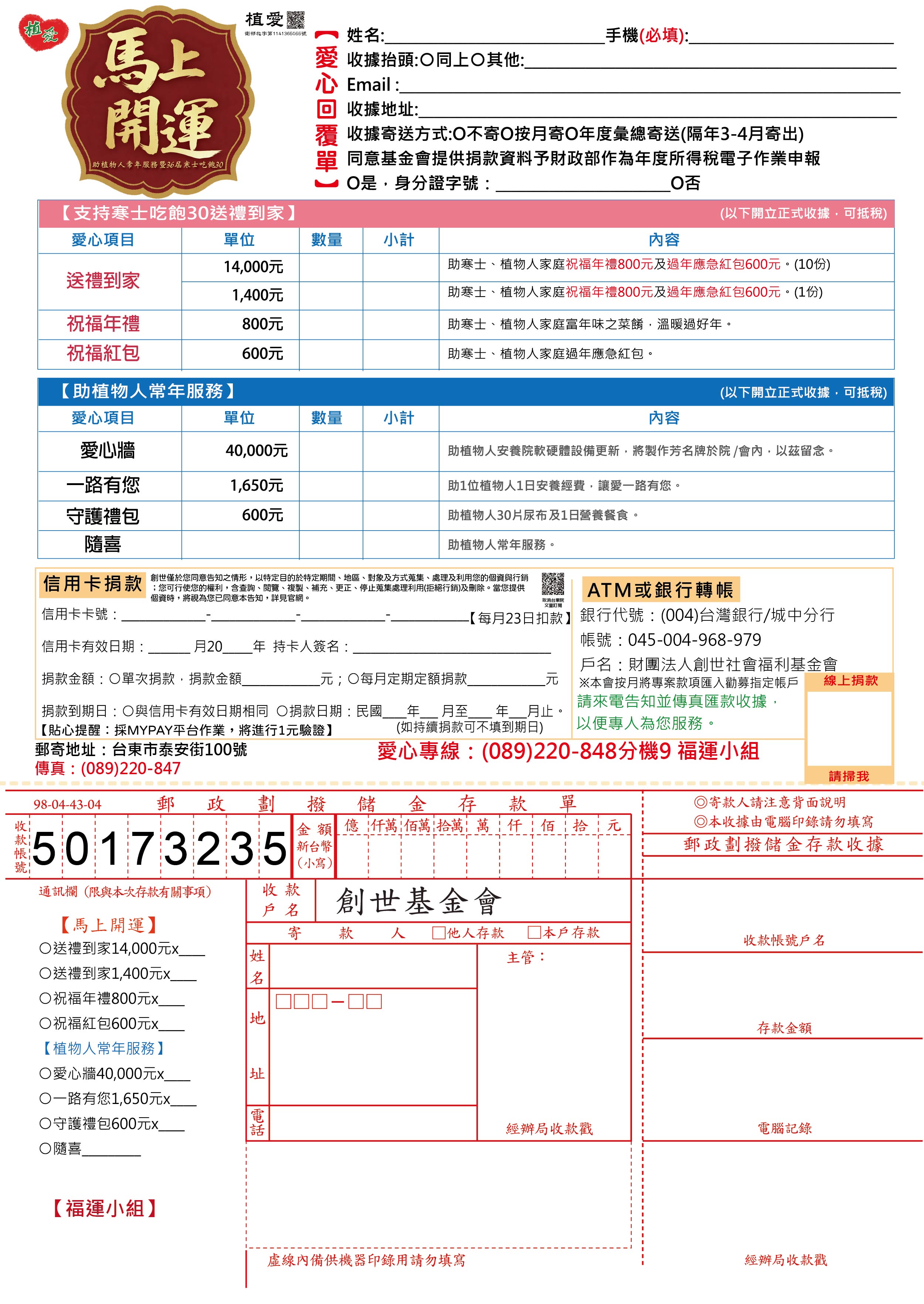 抬頭請開『財團法人創世社會福利基金會』,連同愛心回覆單掛號寄回【福運小組】收。