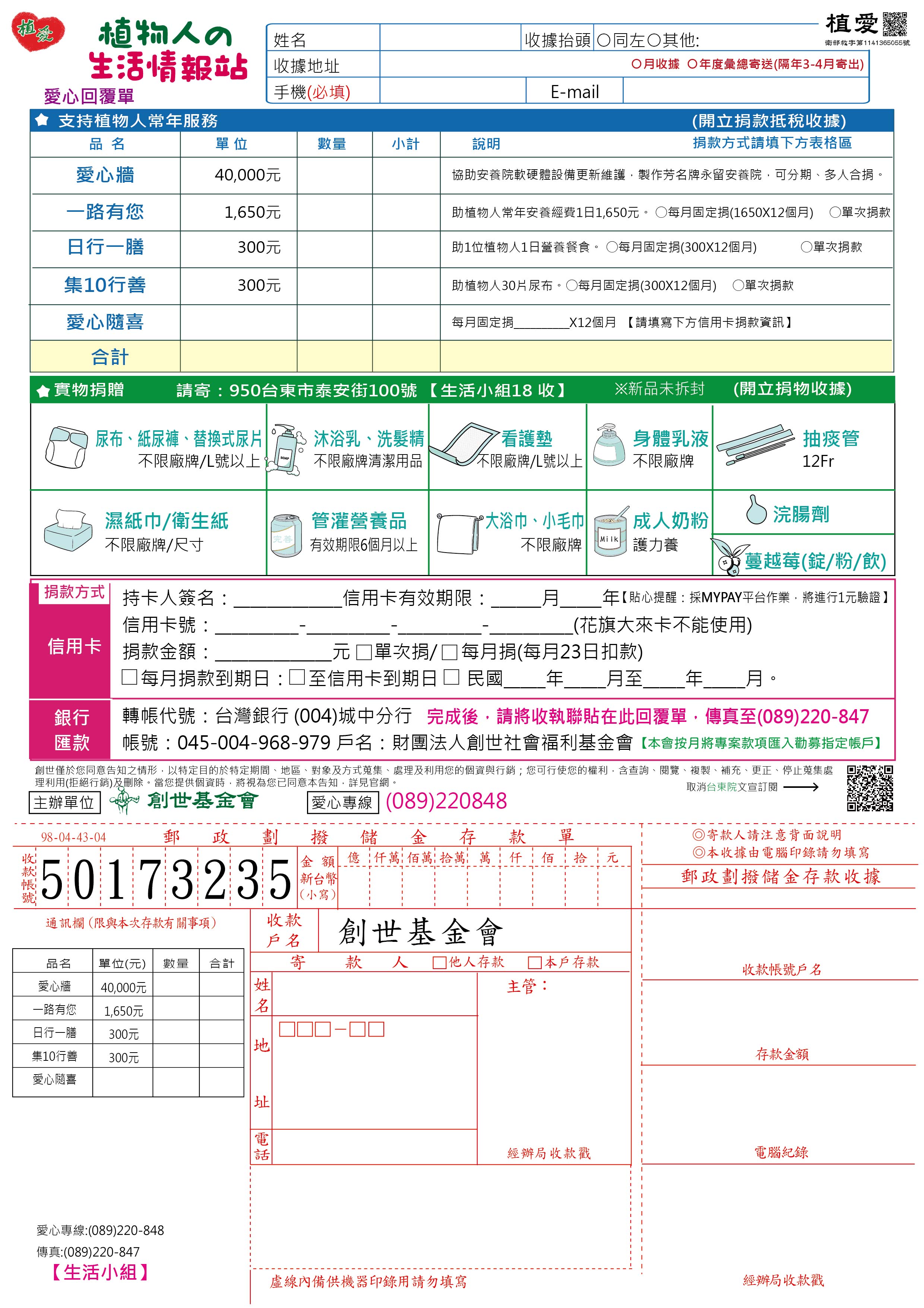 抬頭請開『財團法人創世社會福利基金會』,連同愛心回覆單掛號寄回情報小組收。 【本會按月將專案款項匯入勸募指定帳戶】