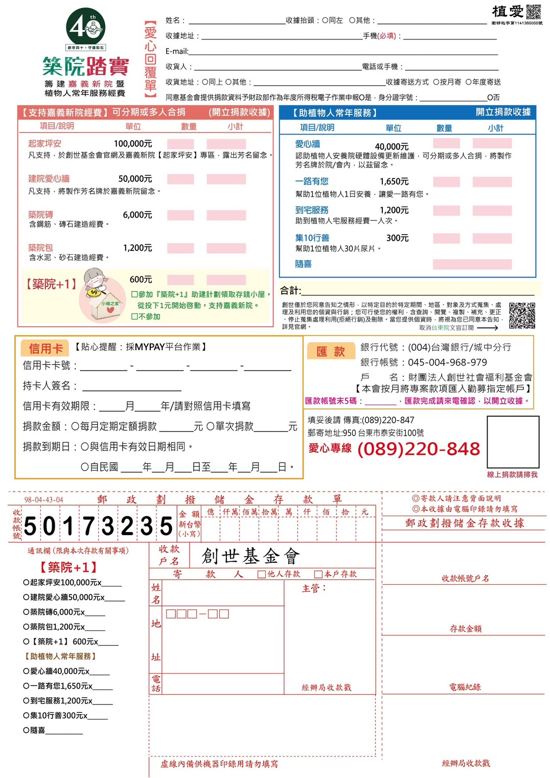 抬頭請開『財團法人創世社會福利基金會』,連同愛心回覆單掛號寄回築院+1小組收。