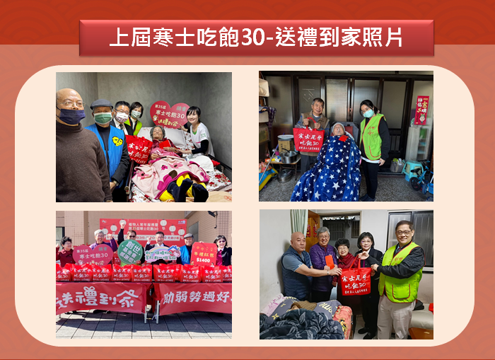 創世基金會「寒士吃飽30」,是每年農曆年前關懷弱勢重要活動,已形成社會愛心運動,近年採「送禮到家」,由工作人員與義工親送植物人家庭及弱勢族群年禮與祝福紅包,讓弱勢族群備感溫馨,感受年節氛圍與社會最大的關懷。