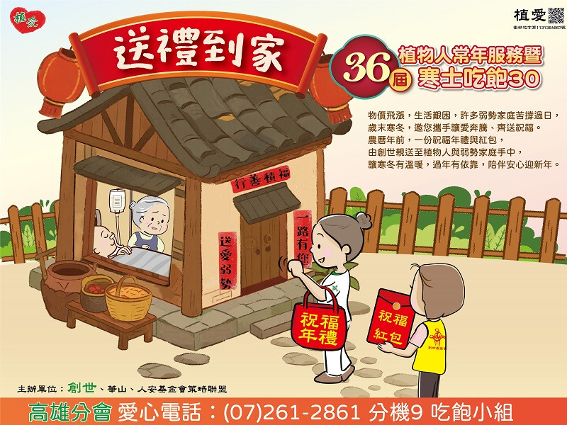 歲末寒冬,邀您攜手讓愛奔騰、齊送祝福。農曆年前,一份祝福年禮與紅包,由創世親送至植物人與弱勢家庭手中,讓寒冬有溫暖、過年有依靠,陪伴他們安心迎新年。