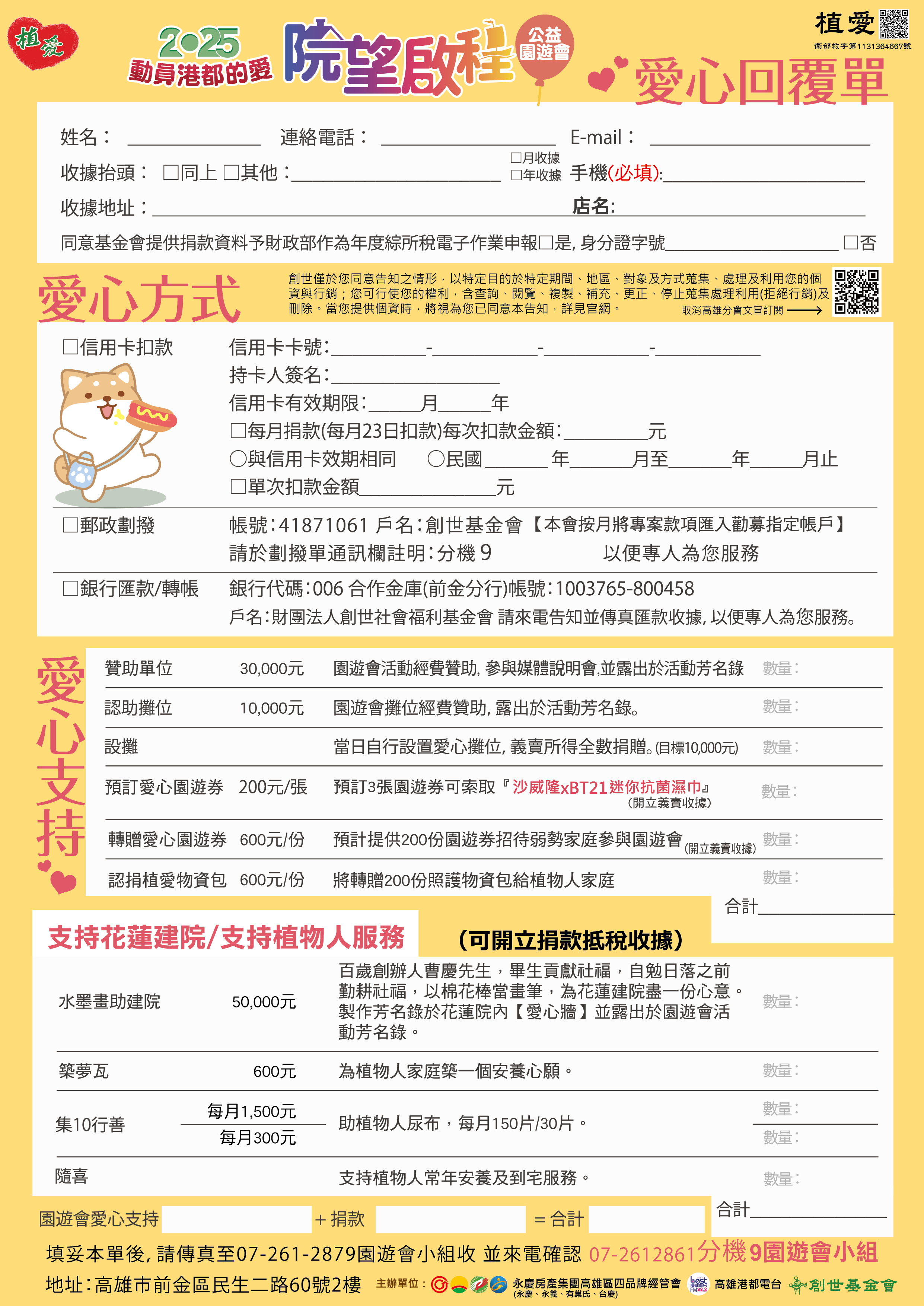 抬頭請開『財團法人創世社會福利基金會』,連同愛心回覆單掛號寄回園遊會小組收。