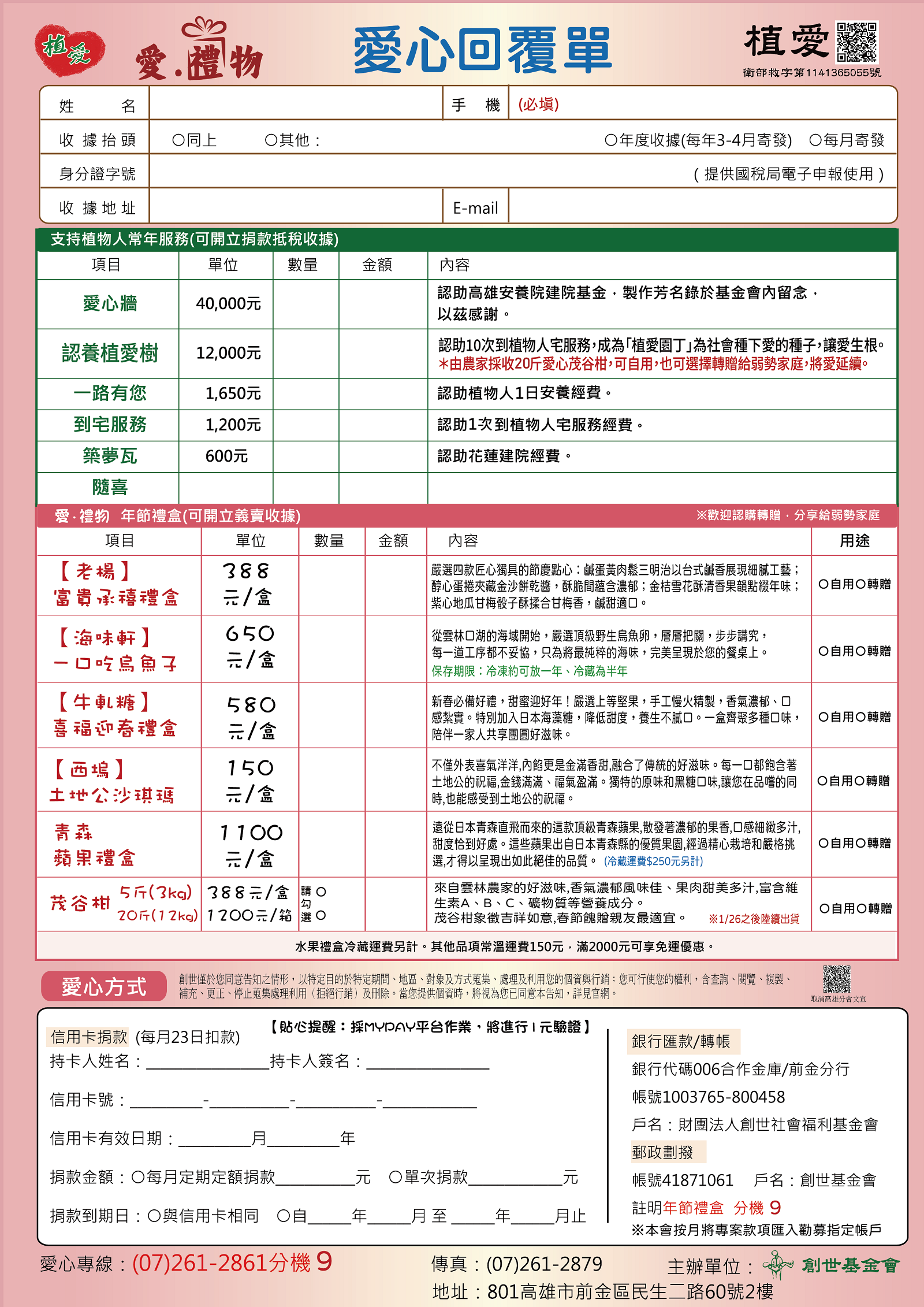 抬頭請開『財團法人創世社會福利基金會』,連同愛心回覆單掛號寄回【愛禮物小組9】收。