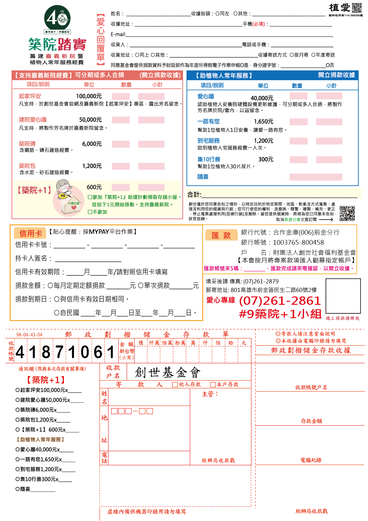 抬頭請開『財團法人創世社會福利基金會』,連同愛心回覆單掛號寄回築院+1小組收。