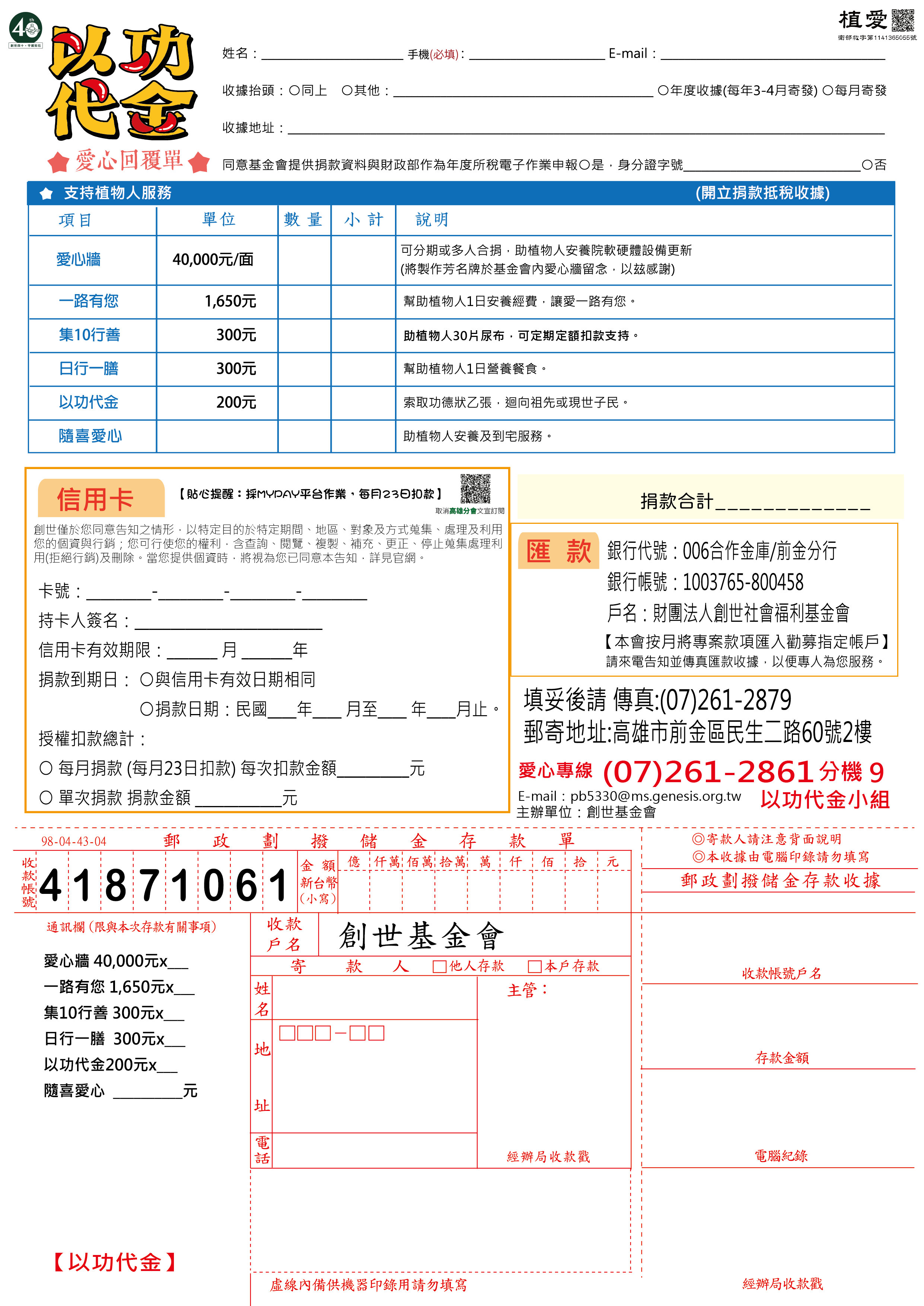 掛號寄至: 高雄市前金區民生二路60號2樓,以功代金小組收