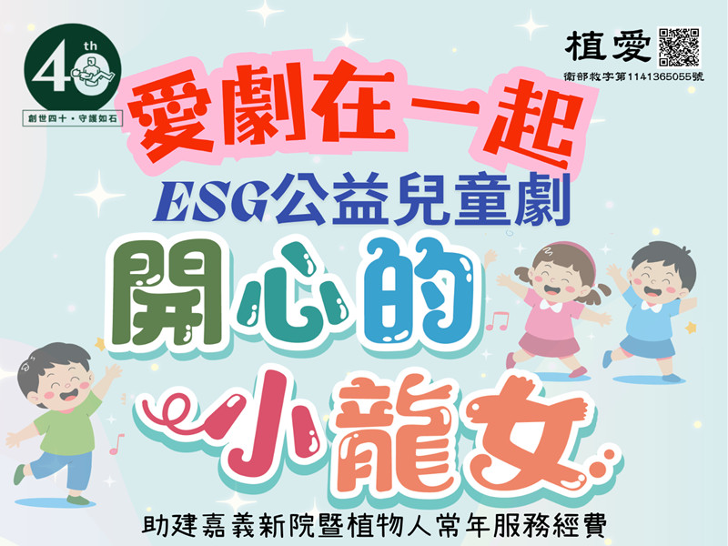 創世基金會 為募集嘉義新院暨植物人常年服務經費,發起「愛劇在一起ESG公益兒童劇」,透過蘋果劇團的戲劇演出,匯集學子愛心,搭配永續議題寓教於樂,守護健康、守護植物人,培養尊重生命、關懷弱勢之精神。推廣社會感恩及行善助人的觀念,集結企業、團體及社會大眾的力量,邀請大家響應公益。