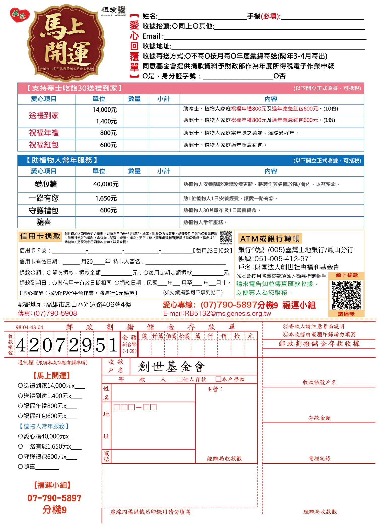 抬頭請開『財團法人創世社會福利基金會』,連同愛心回覆單掛號寄回【福運小組】收。