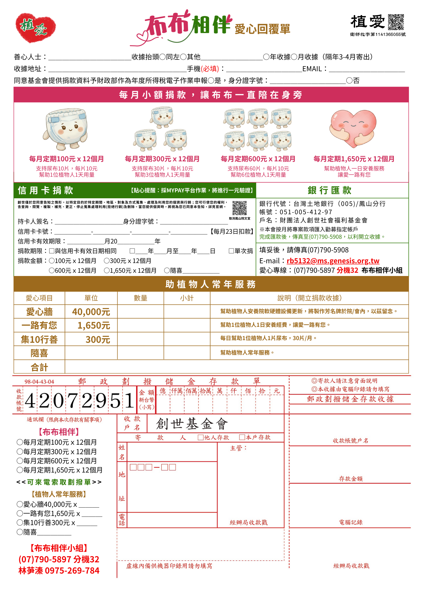 ※轉帳完成,請來電告知帳號末五碼、收據抬頭、地址,或將存根聯、收據抬頭、電話、地址傳真至(07)790-5908,註明【布布相伴小組】,以開立收據。
