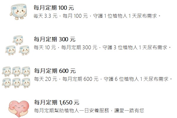 幫助1位植物人1日安養經費,讓愛一路有您。