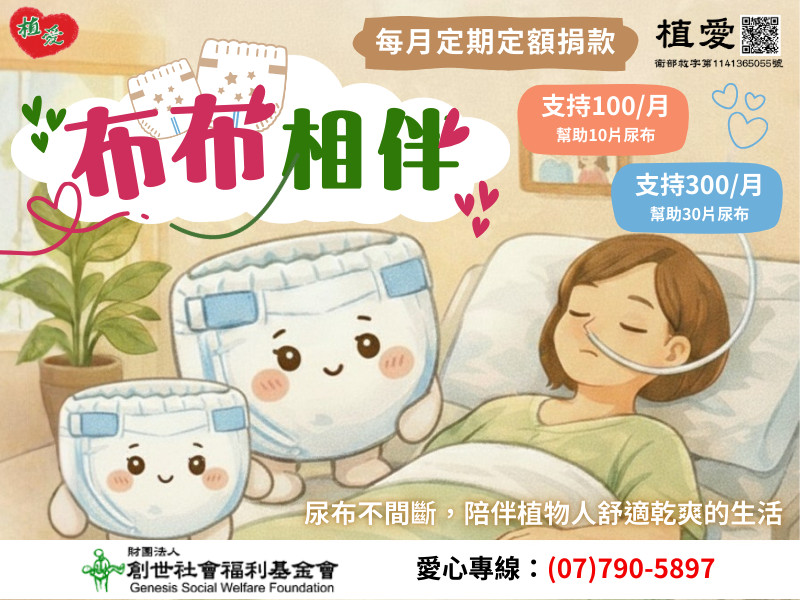 創世基金會鳳山分院安養68位清寒家庭植物人,到宅服務近2百位植物人及失能老人。每位植物人每天約需使用 10–12 片尿布,對許多家庭來說是長期沉重的負擔。邀請您認助尿布,陪伴植物人最舒適乾爽的生活。