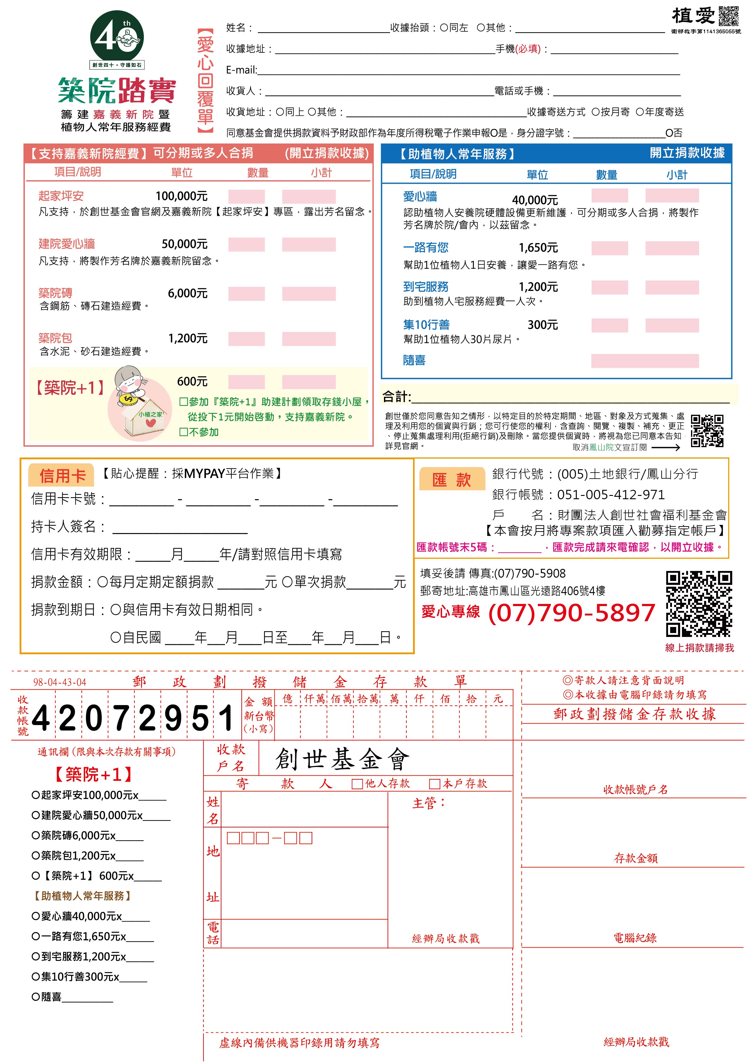 抬頭請開『財團法人創世社會福利基金會』,連同愛心回覆單掛號寄回築院+1小組收。