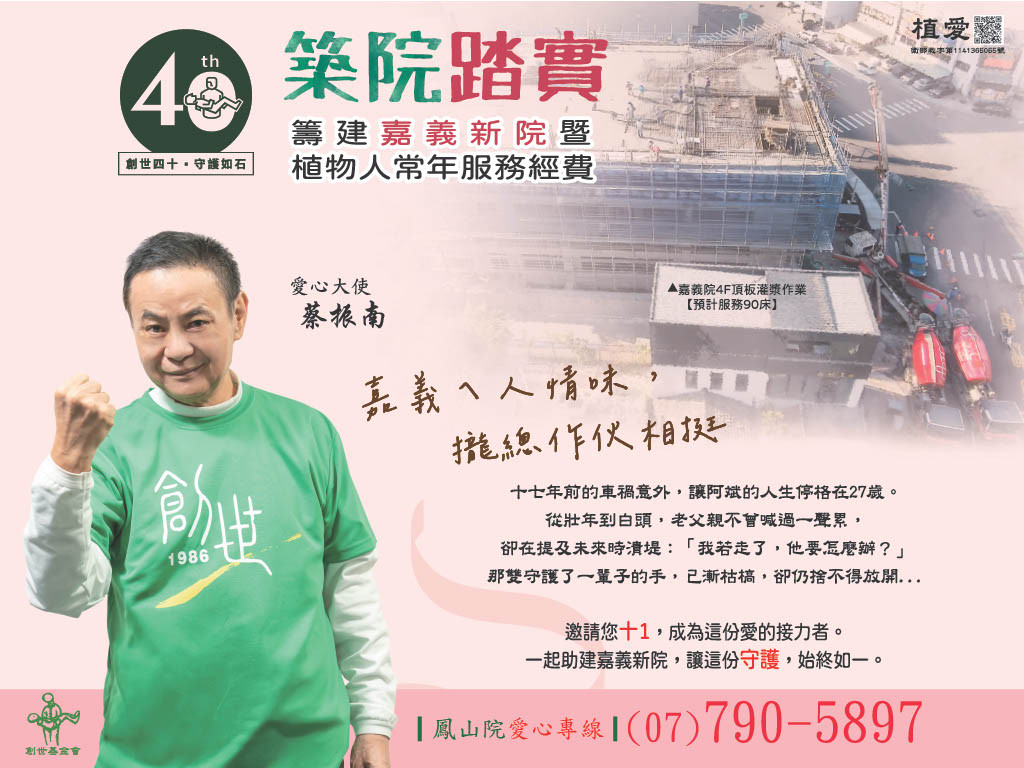 然而,在許多我們看不見的社會角落,仍有無數弱勢家庭正苦苦等待援助。嘉義院目前已滿床,卻仍有許多個案急需入住。為了不讓家庭在無助中崩潰,我們誠摯邀請您一起助建植物人的堡壘──嘉義新院,為等待中的生命撐起一個可以安心託付的家。