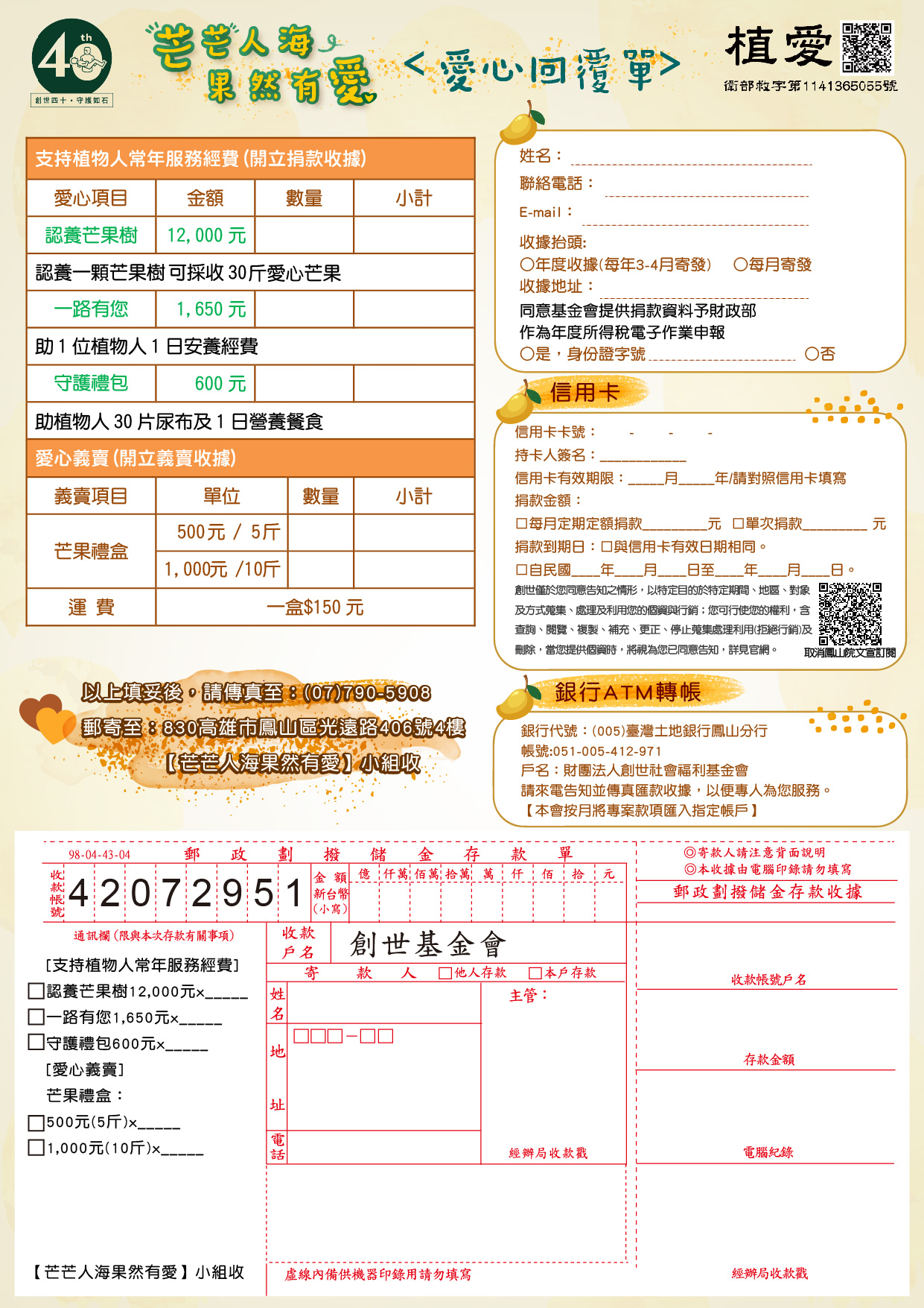 1.認養芒果樹 :12,000元,認養一棵芒果樹,可採收30斤愛心芒果,有農家代為採收。