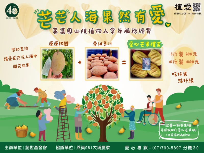 植物人安養是條漫長的路,需匯集眾人力量,給予穩定持續的照顧。邀請大家一同響應,甜在嘴裡,暖在心裡,讓芒果的甜,成為照顧植物人的力量,義賣所得支持植物人安養及到宅服務,數量有限,賣完為止。