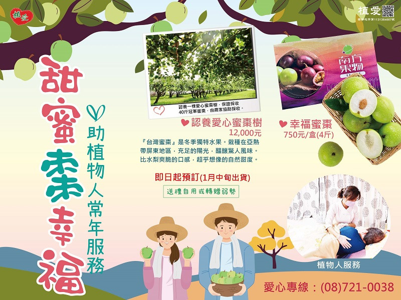 2.認養愛心蜜棗樹12,000元:認養一棵愛心果樹,保證採收40斤幸福蜜棗,由農家採收.