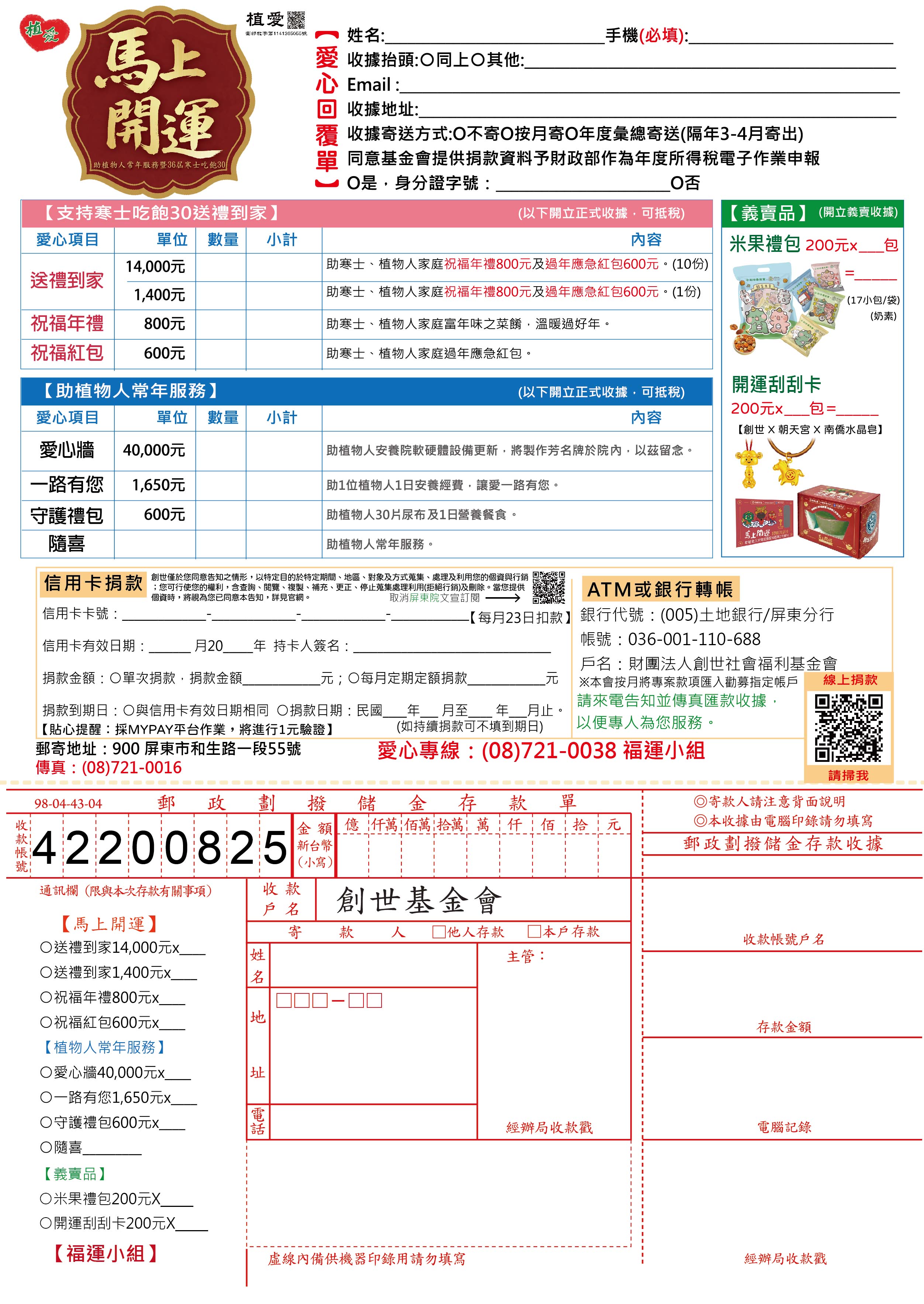 抬頭請開『財團法人創世社會福利基金會』,連同愛心回覆單掛號寄回【福運小組】收。