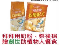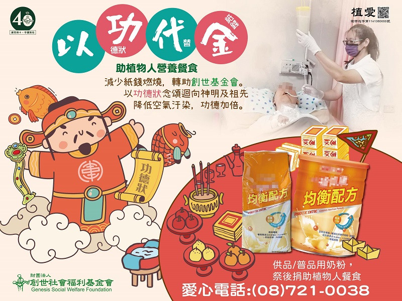 將部分供品/普渡品用「均衡營養奶粉」取代,祭拜後捐贈創世基金會,讓植物人補充每日營養,維持健康,讓愛延續。