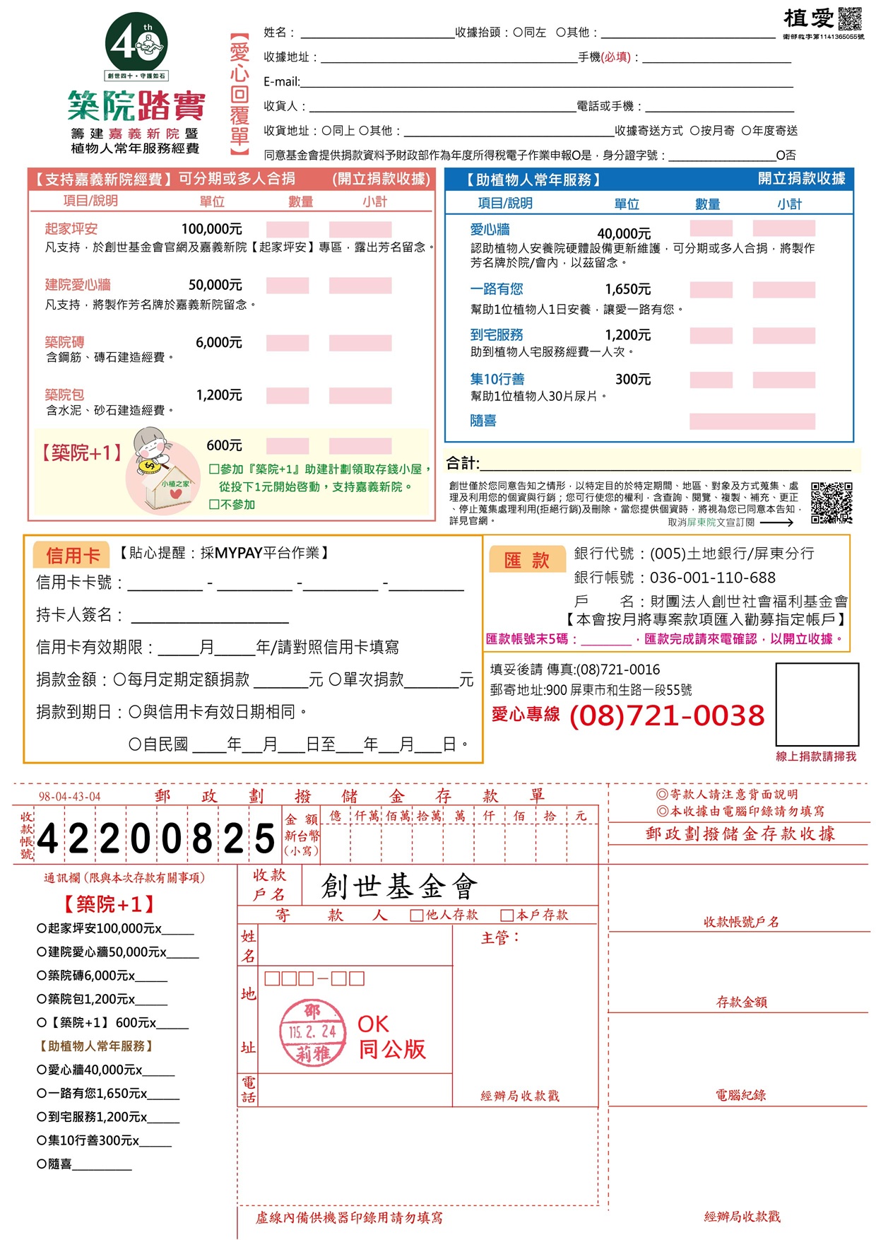 抬頭請開『財團法人創世社會福利基金會』,連同愛心回覆單掛號寄回築院+1小組收。