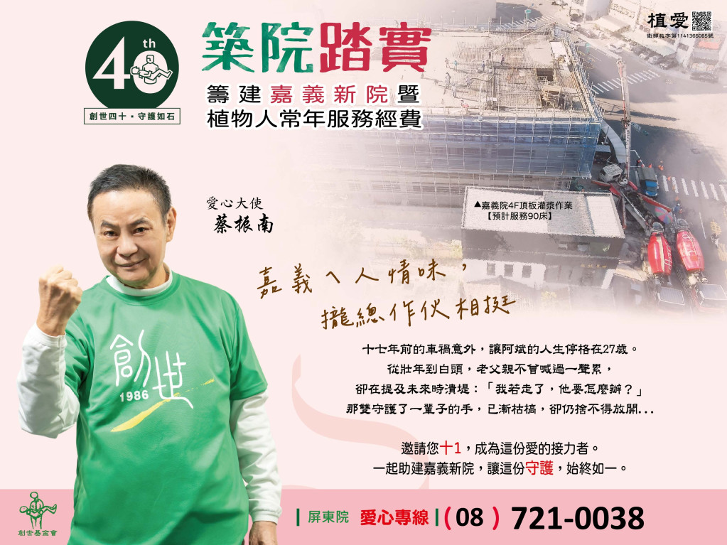然而,在許多我們看不見的社會角落,仍有無數弱勢家庭正苦苦等待援助。嘉義院目前已滿床,卻仍有許多個案急需入住。為了不讓家庭在無助中崩潰,我們誠摯邀請您一起助建植物人的堡壘──嘉義新院,為等待中的生命撐起一個可以安心託付的家。