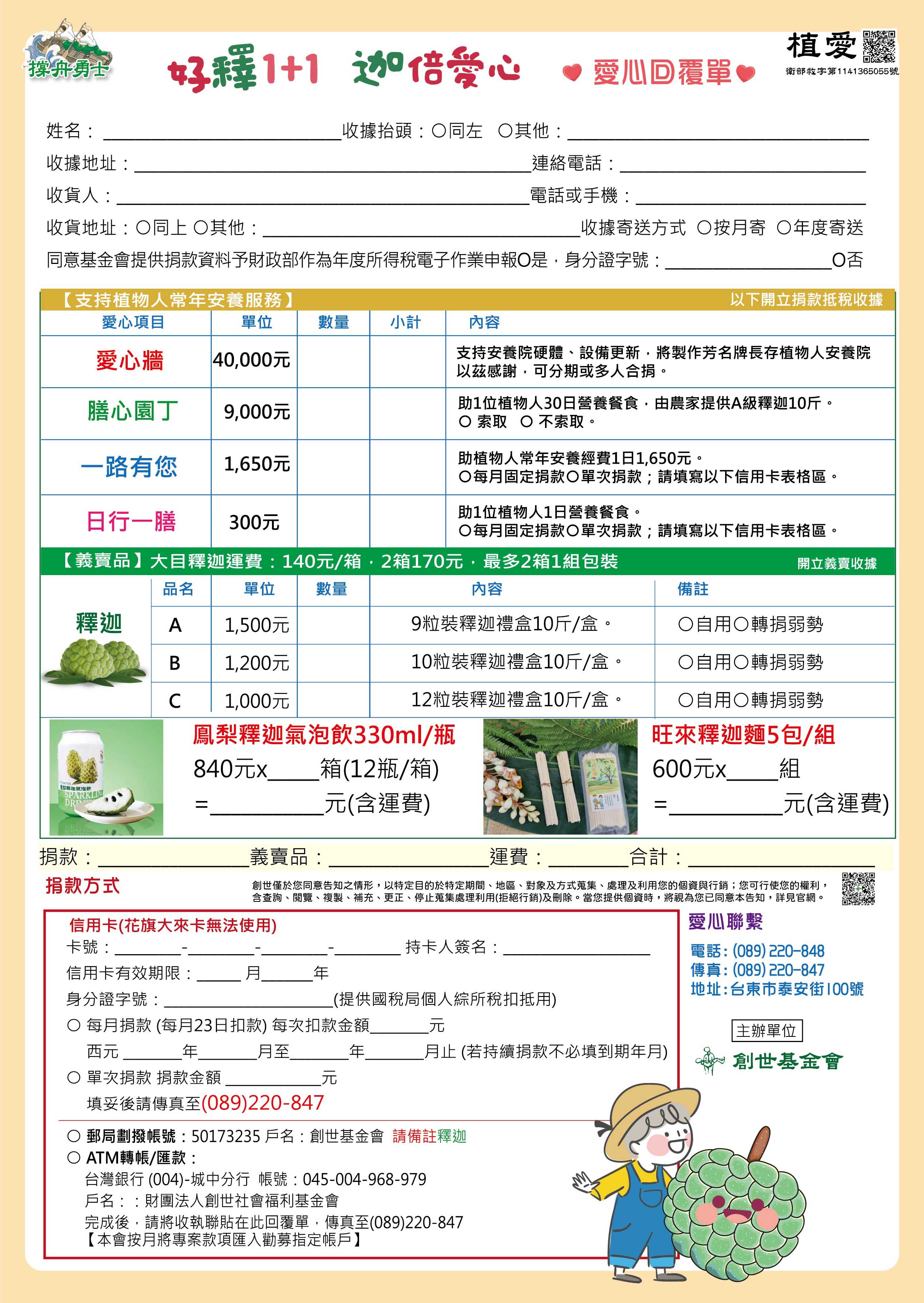 說明:助1位植物人30日營養餐食,由農家提供A級釋迦10斤。