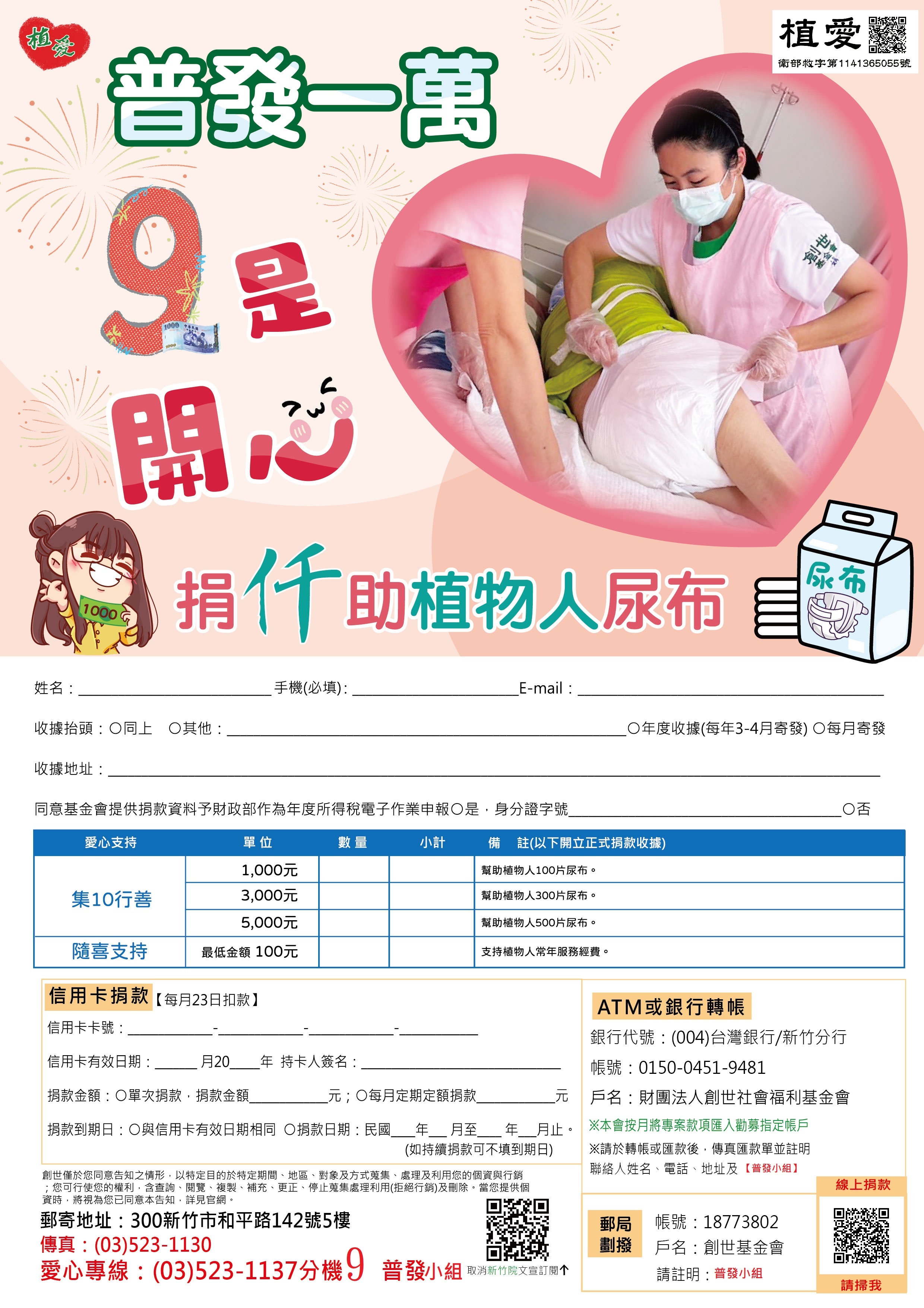 抬頭請開『財團法人創世社會福利基金會』,連同愛心回覆單掛號寄回【普發愛心】收。