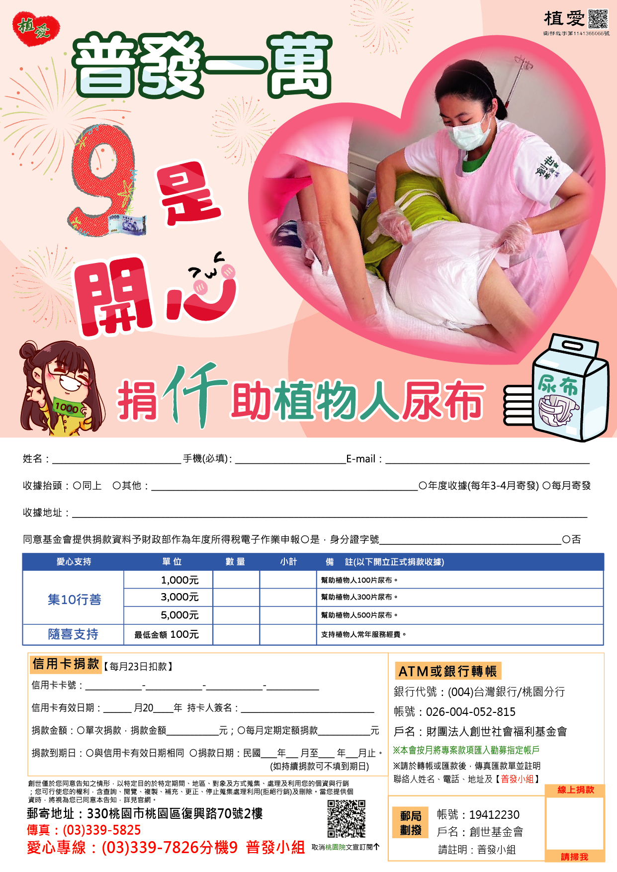 抬頭請開『財團法人創世社會福利基金會』,連同愛心回覆單掛號寄回【普發小組】收。